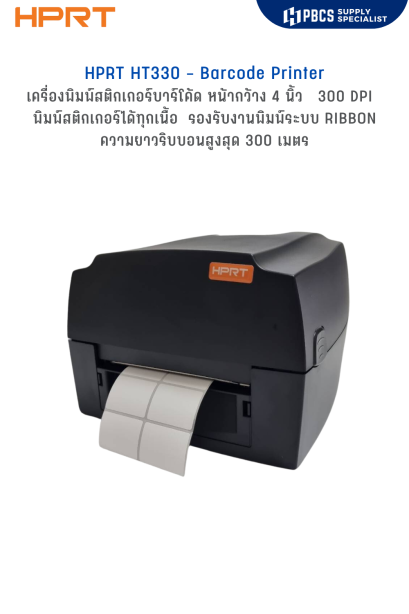 เครื่องพิมพ์สติกเกอร์ HPRTรุ่น HT330 ความละเอียด 300 dpi เครื่องพิมพ์บาร์โค้ดแบบตั้งโต๊ะ ที่นิยมใช้ในงานที่ต้องการความสะเอียดสูง ที่มีตัวหนังสือ หรือบาร์โค้ดขนาดเล็ก แต่ต้องการความคมชัดในการพิมพ์ เช่นงานพิมพ์ฉลากสินค้าขนาดเล็ก ฉลาก ศคบ. ป้ายราคาสินค้ากลุ่มจิวเวอร์รี่ เช่นเครื่องทอง ชุดเครืองเพชร เนื่องจากเป็นงานพิมพ์ที่มีพื้นที่ในการติดชิ้นงานจำกัด เป็นต้น HPRT HT330 จัดเป็นเครื่องพิมพ์กลุ่มความสะเอียดสูง แต่ราคาอยู่ในระดับใกล้เคียงกับเครื่องพิมพ์ความละเอียด 203 dpi ราคาคุ้มค่าต่อการใช้งาน ความเร็วในการพิมพ์ 4 นิ้วต่อวินาที พิมพ์ได้กว้างถึง 4.17 นิ้ว หน่วยความจำ RAM 32 MB , ROM 16 MB รองรับการต่อยอดพัฒนาโปรแกรมโดยมี SDK สำหรับ Windows, MacOS, Android และ iOS