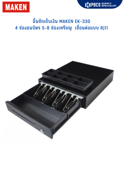 ลิ้นชักเก็บเงิน MAKEN EK-330 ช่องเก็บธนบัตร 4 ช่อง ช่องเก็บเหรียญ 5-8 ช่อง ใช้งานร่วมกับโปรแกรม POS ชั้นนำได้ทุกโปรแกรม เช่น Wongnai Lineman Silom Ocha POSPOS เป็นต้น
