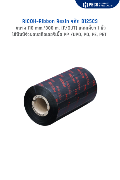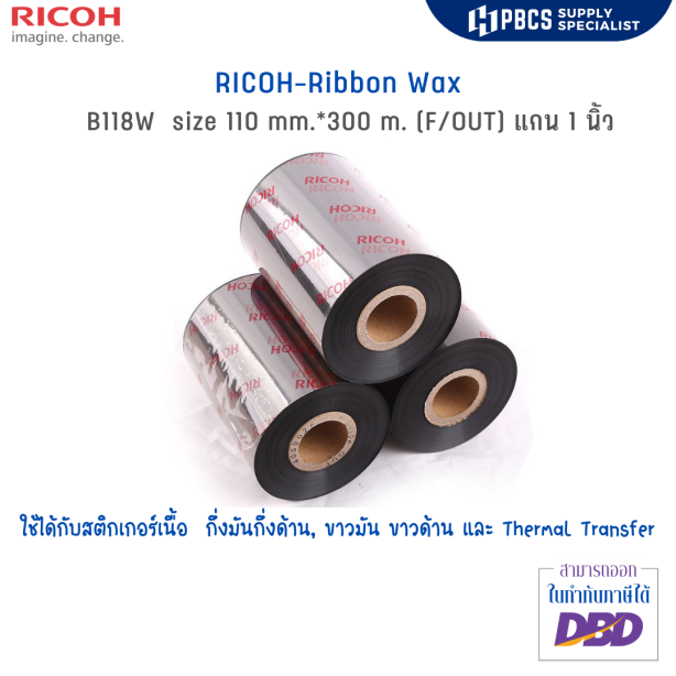 RICOH B118W หน้ากว้าง 110 มิลลิเมตร ความยาว 300 เมตร การม้วนแบบ F/OUT ขนาดของแกน 1 นิ้ว หมึกสีดำ ทนความร้อน 50-60°C เหมาะสำหรับใช้กับงานสติกเกอร์แบบธรรมดา เช่น แบบกึ่งมันกึ่งด้าน หรือ Semigross สติ๊กเกอร์แบบขาวด้าน , ฟิล์ม PET/PP/PE/PVC เช่น งานพิมพ์ป้ายชื่อ ป้ายราคา ป้ายเสื้อผ้าบาร์โค้ด ป้ายสินค้าปลีก ฉลากสินค้าทั่วไป ระบบการขนส่งต่างๆ , สติ๊กเกอร์ส่งจดหมาย , ใบเสร็จรับเงิน , สติ๊กเกอร์เครื่องชั่ง , ป้ายชั้นวางสินค้า , สติ๊กเกอร์ที่อยู่ติดกล่องพัสดุ และ Healthcare