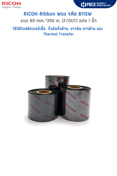 RICOH B115W Wax Ribbon หมึกริบบอน หน้ากว้าง 80 มิลลิเมตร ความยาว 300 เมตร การม้วนแบบ F/OUT ขนาดของแกน 1 นิ้ว หมึกสีดำ ทนความร้อนได้สูงถึง 50-60°C เหมาะสำหรับใช้กับงานสติกเกอร์แบบธรรมดา เช่น แบบกึ่งมันกึ่งด้าน หรือสติ๊กเกอร์แบบขาวด้าน เช่น งานพิมพ์ป้ายชื่อ ป้ายราคา ป้ายเสื้อผ้าบาร์โค้ด ป้ายสินค้าปลีก ฉลากสินค้าทั่วไป ระบบการขนส่งต่างๆ , สติ๊กเกอร์ส่งจดหมาย , ใบเสร็จรับเงิน , สติ๊กเกอร์เครื่องชั่ง , ป้ายชั้นวางสินค้า , สติ๊กเกอร์ที่อยู่ติดกล่องพัสดุ และ Healthcare