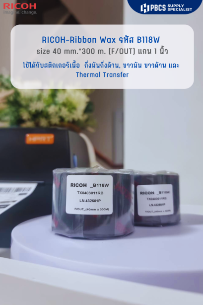 RICOH B118W หน้ากว้าง 40 มิลลิเมตร ความยาว 300 เมตร การม้วนแบบ F/OUT ขนาดของแกน 1 นิ้ว หมึกสีดำ ทนความร้อน 50-60°C เหมาะสำหรับใช้กับงานสติกเกอร์แบบธรรมดา เช่น แบบกึ่งมันกึ่งด้าน หรือ Semigross สติ๊กเกอร์แบบขาวด้าน สติ๊กเกอร์ขาวมัน , หรือสติ๊เกอร์ Thermal Transfer เป็นต้น