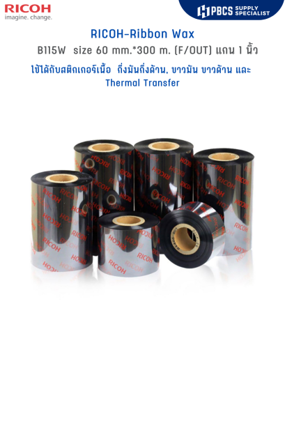 RICOH B115W Wax Ribbon หมึกริบบอน หน้ากว้าง 60 มิลลิเมตร ความยาว 300 เมตร การม้วนแบบ F/OUT ขนาดของแกน 1 นิ้ว หมึกสีดำ ทนความร้อนได้สูงถึง 50-60°C เหมาะสำหรับใช้กับงานสติกเกอร์แบบธรรมดา เช่น แบบกึ่งมันกึ่งด้าน หรือ Semigloss สติ๊กเกอร์แบบขาวด้าน เช่น งานพิมพ์ป้ายชื่อ ป้ายราคา ป้ายเสื้อผ้าบาร์โค้ด ป้ายสินค้าปลีก ฉลากสินค้าทั่วไป ระบบการขนส่งต่างๆ , สติ๊กเกอร์ส่งจดหมาย , ใบเสร็จรับเงิน , สติ๊กเกอร์เครื่องชั่ง , ป้ายชั้นวางสินค้า , สติ๊กเกอร์ที่อยู่ติดกล่องพัสดุ และ Healthcare