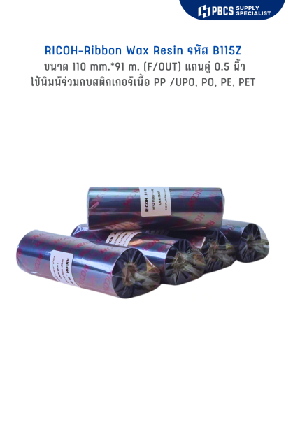 ริบบอน Ricoh B115Z (Wax-Resin) เป็นริบบอน ประเภทแวกซ์เรซิ่น ที่พัฒนามาใหม่ล่าสุดจากทาง Ricoh ซึ่งมาช่วยทำให้งานพิมพ์ของคุณง่ายขึ้น คมชัดขึ้น และอายุการใช้งานนานกว่าเดิม รวมถึงประเภทใช้งานยังสามารถช่วยให้เครื่องพิมพ์ทำงานได้อย่างเต็มประสิทธิภาพ ไม่เป็นอันตรายต่อหัวพิมพ์ ยืดอายุการใช้งานนานข้นอีกเช่นกัน