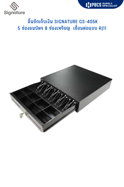 ขนาด 405 (กว้าง) x 415 (ลึก) x 90 (สูง) มิลลิเมตร ช่องเก็บธนบัตร 5 ช่อง ช่องเก็บเหรียญ 8 ช่อง เชื่อมต่อแบบ RJ12 สามารถต่อเข้ากับเครื่องพิมพ์ใบเสร็จได้ทุกยี่ห้อ และใช้งานร่วมกับเครือง POS ได้ทั้ง Lineman POS, Wongnai POS, Ocha POS, POSPOS Loyverse POS เป็นต้น