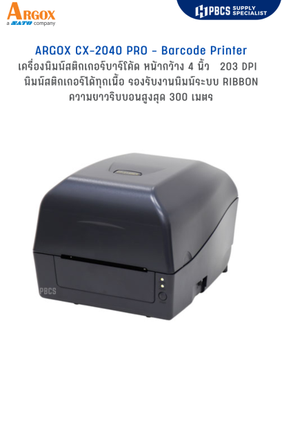 ARGOX CX-2040 PRO เครื่องพิมพ์บาร์โค้ด แบบตั้งโต๊ะ ราคาประหยัด รองรับการพิมพ์ได้ทั้ง 2 ระบบ 1. แบบถ่ายโอนความร้อนผ่านผ้าหมึก (Thermal Transfer) 2. แบบถ่ายโอนความร้อนโดยตรง (Direct Thermal) มาพร้อมโปรแกรมออกแบบบาร์โค้ด The BarTender Ultralite. เหมาะสำหรับผู้ที่เริ่มใช้เครื่องพิมพ์บาร์โค้ด ความเร็วในการพิมพ์ 6 นิ้ว/วินาที รองรับหน้ากว้างสูงสุด 108 มิลลิเมตร ความละเอียด 203 dpi หน่วยความจำ 32 MB SDRAM และ 16 MB Flash Memory การเชื่อมต่อ USB 2.0