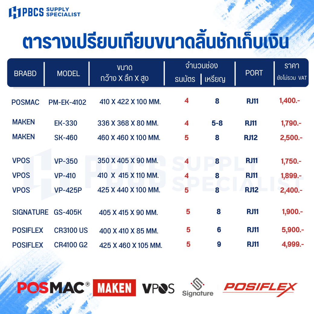 พีบีซีเอส รวบรวมลิ้นชักเก็บเงินที่ใช้ใช้งานได้จริง และทำงานได้ดีกับระบบ POS และช่วยลดปัญหาไม่รู้จะเลือกรุ่นไหนดีที่จะเหมาะกับร้านค้าของเรา เปรียบเทียบข้อมูลได้จากตารางเทียบขนาดได้เลยค่ะ