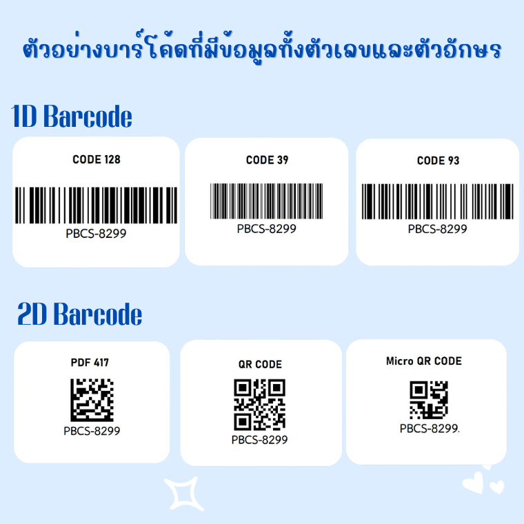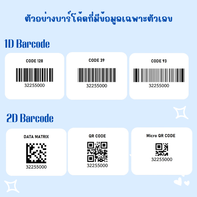 ทั้งนี้ขนาดหรืออัตราส่วนของบาร์โค้ดสามารถปรับได้ค่ะ และขนาดจะขึ้นอยู่กับจำนวนตัวเลขและตัวอักษรที่ใช้ค่ะ ในกลุ่ม 1D Barcode หากมีดวงสติ๊กเกอร์ที่ค่อนข้างเล็ก หรือพื้นที่สำหรับติดสติ๊กเกอร์มีค่อนข้างจำกัด และมีเครื่องอ่านบาร์โค้ดที่รองรับ 2D Barcode แนะนำให้ใช้เป็น 2D Barcode เช่น QR CODE ที่สามารถบันทึกข้อมูลได้ยาวกว่า 1,000 ตัวอักษร แทนการใช้ 1D Barcode ค่ะ