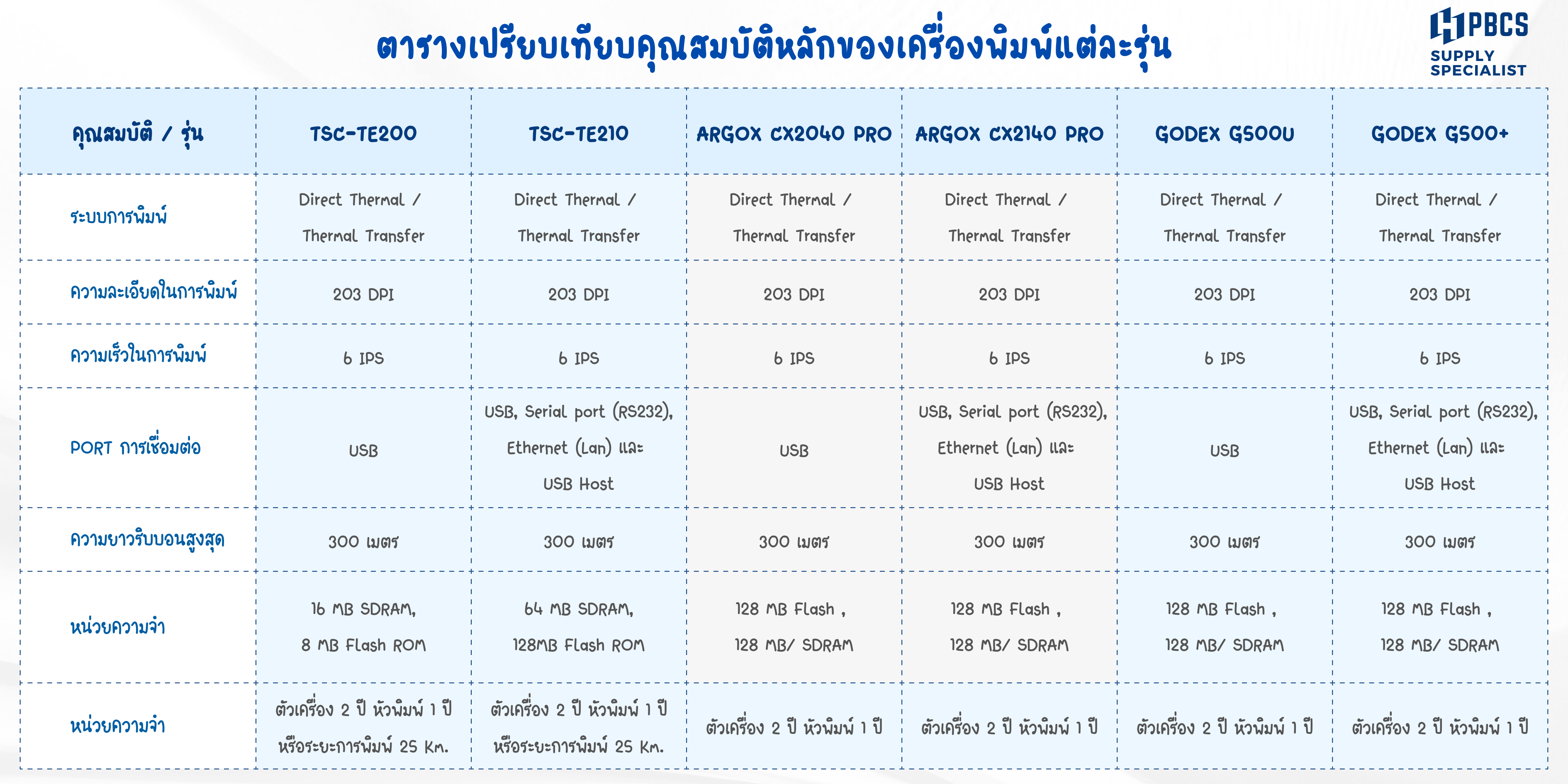 PBCS สรุปเครื่องพิมพ์บาร์โค้ดสำหรับอุตสาหกรรมขนาดเล็กที่เป็นที่ยอมรับจากกลุ่มผู้ใช้ โดยมี 3 แบรนด์หลักอย่าง TSC, Argox และ GoDEX ที่ยังคงเป็นตัวเลือกอันดับต้นๆ ด้วยความทนทานและคุ้มค่ากับราคาที่ต้องจ่าย โดยทั้ง 3 แบรนด์มีสเปคที่ใกล้เคียงกัน และ PCBS สรุปจุดเด่น ทั้ง 3 รุ่น โดยมีตารางเปรียบเทียบฟังก์ชั่นอยู่ด้านล่างนี้ค่ะ