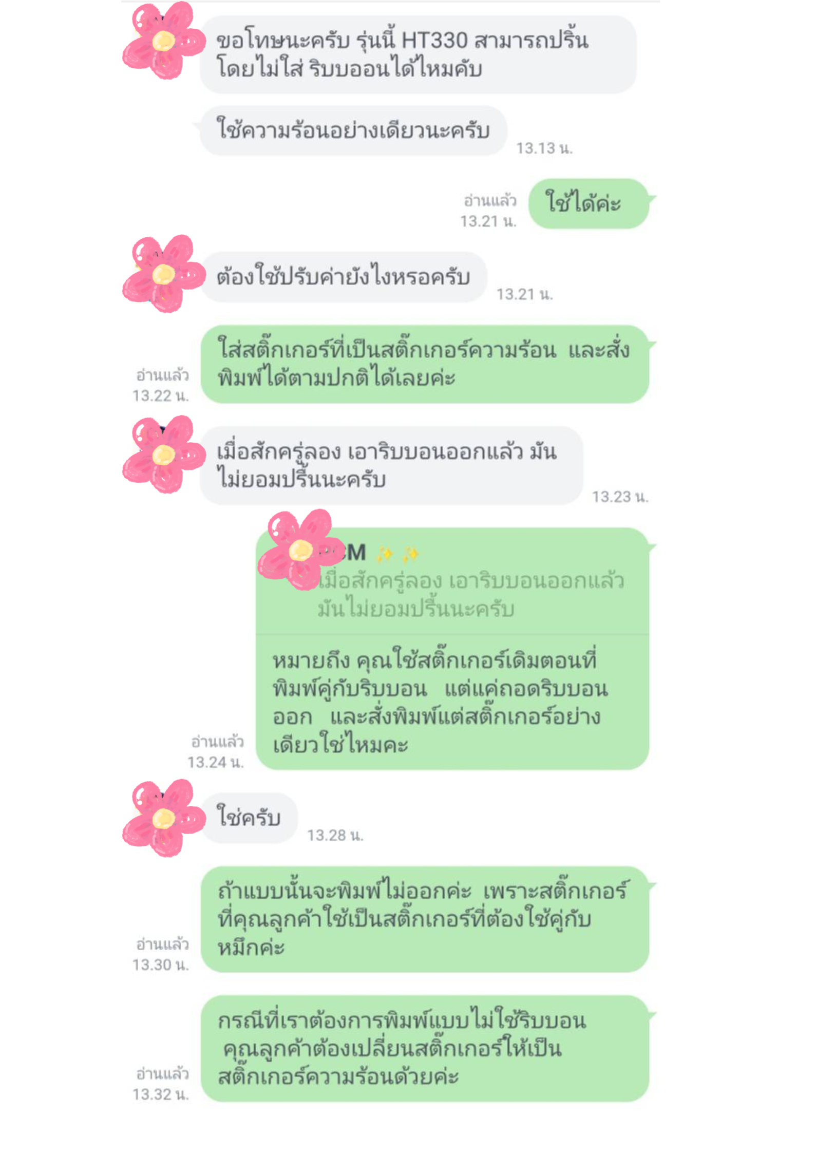 - กรณีที่ใช้สติ๊กเกอร์ความร้อน ไม่ต้องใช้หมึกริบบอน แต่ถ้าหากใช้ริบบอนคู่กับสติ๊กเกอร์ความร้อน ก็สามารถพิมพ์ข้อความได้ และข้อความก็จะเข้มกว่าปกติ แต่ก็จะเปลืองหมึกค่ะ และถ้าตั้งค่าความเข้มไว้สูง อาจจะพบหมึกเลอะระหว่างพิมพ์ได้ค่ะ