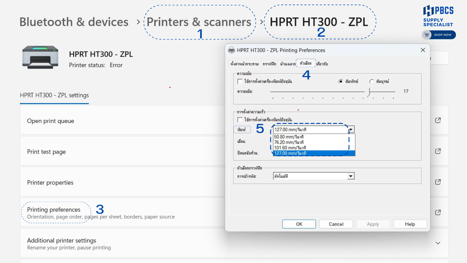 เครื่องพิมพ์ HPRT HT100 / HT300 /HT330 สามารถปรับความเร็วในการพิมพ์ให้เหมาะสมกับงานได้ มีขั้นตอนที่ไม่ซับซ้อน และผู้ใช้งานสามารถปรับได้ ตามเมนูคำสั่งดังต่อไปนี้
