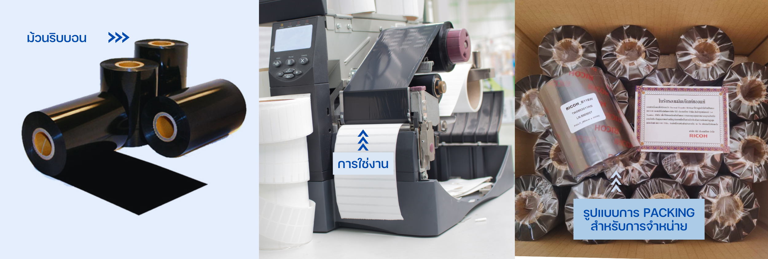 การใช้งานริบบอน จะนำไปใช้พิมพ์ร่วมกับสติ๊กเกอร์ ผ่านเครื่องพิมพ์ที่รองรับการใส่ริบบอน การเลือกใช้สติ๊กเกอร์และริบบอนที่ถูกต้องจะเป็นการเพิ่มประสิทธิภาพในกระบวนการทำงาน โดยเฉพาะงาน Supply Chain เช่น ฉลากสินค้า, งานที่เกี่ยวข้องกับคลังสินค้า และงานที่เกียวของกับระบบ Logistics เป็นต้น