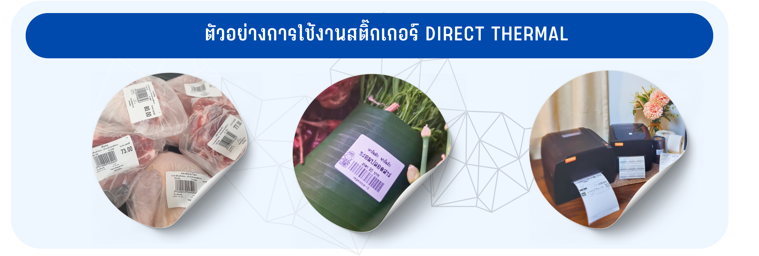 สติ๊กเกอร์ Direct Thermal เป็นสติ๊กเกอร์ที่ไม่ต้องใช้หมึกริบบอนในการพิมพ์ เนื่องจากหน้าสติ๊กเกอร์มีการเคลือบสารเคมีที่มีปฏิกิริยากับความร้อนจากหัวพิมพ์ของเครื่องพิมพ์บาร์โค้ดหรือเครื่องชั่ง ทำให้ปรากฎข้อความได้โดยไม่ต้องใข้หมึก