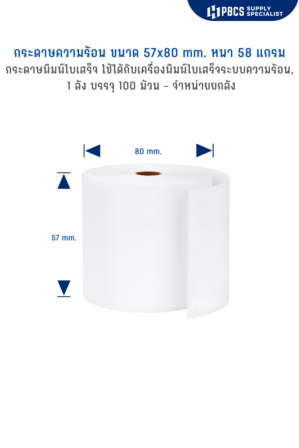 กระดาษความร้อน (Thermal Paper) กระดาษพิมพ์ใบเสร็จ ขนาด 57x80 มม. เคลือบเคมีอย่างดี ม้วนแน่น พิมพ์คมชัด ใช้สำหรับเครื่องพิมพ์ใบเสร็จ / Mobile POS / บัตรคิว 1 กล่องบรรจุ 100 ม้วน